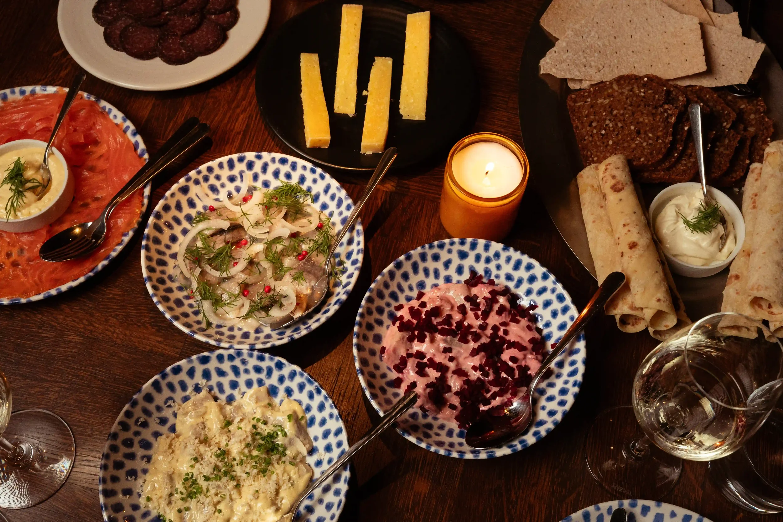 Sild, røkt laks, Västerbottenost og masse tilbehør